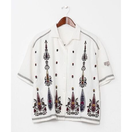 [型番:ILL-6113-2026]インドの民族衣装レヘンガのエッセンスを取り入れた開襟シャツ。袖口には「とても美しい」という意味のヒンディー語がビーズ刺しゅうであしらわれ、細部にまでこだわりが光る。軽やかな着心地で季節を問わず活躍。