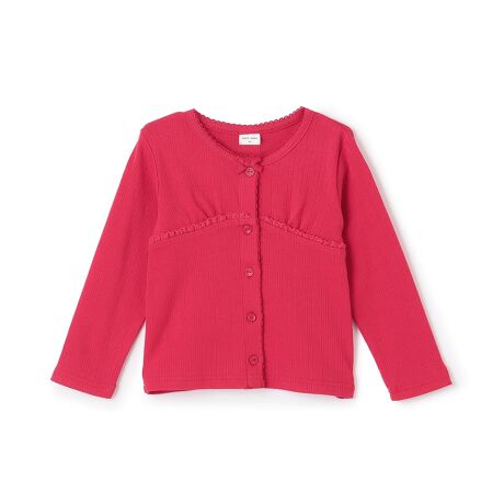 針ぬきによる生地の凹凸感がアクセントになっているカーディガンです。レースとミニリボンをあしらい、可愛い雰囲気を高めました。UVカットの機能がついているため、日差しが強い日のコーデにおすすめ。さわやかなデニムパンツや、女の子らしいフリルスカートと好相性です。内側にお名前を記入できるタグつき。