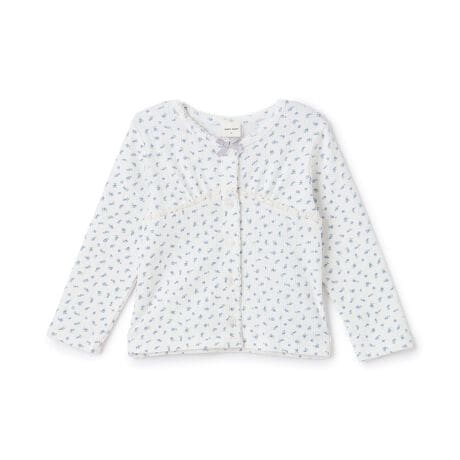 針ぬきによる生地の凹凸感がアクセントになっているカーディガンです。レースとミニリボンをあしらい、可愛い雰囲気を高めました。UVカットの機能がついているため、日差しが強い日のコーデにおすすめ。さわやかなデニムパンツや、女の子らしいフリルスカートと好相性です。内側にお名前を記入できるタグつき。
