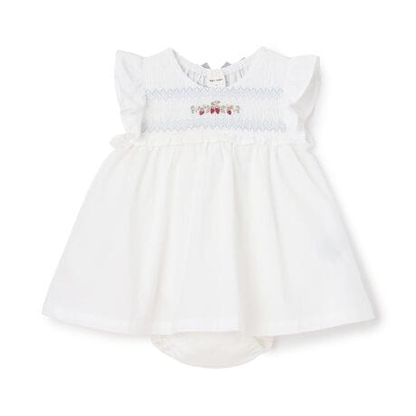 いちごの刺しゅうとつけ外しできるリボンが可愛いワンピースタイプのロンパースです。
