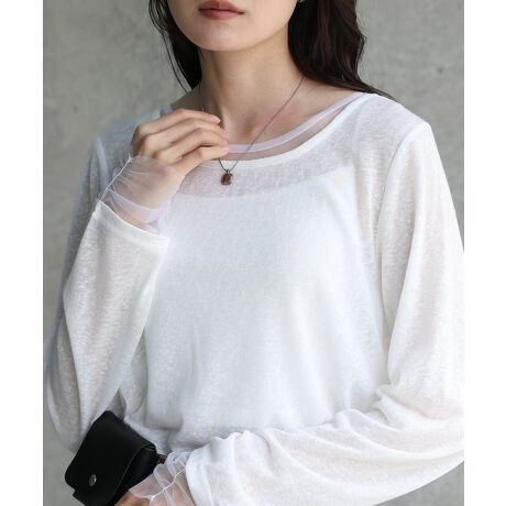 デニムやスラックスと合わせたシンプルコーデはもちろん、キャミワンピースやジャンスカのインナーとしてもおすすめ。首元と袖のチュールがアクセントになり、レイヤードスタイルも軽やかに決まります。