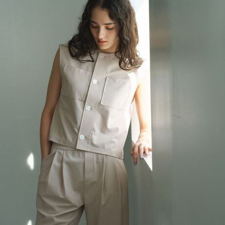 日々の気温差が激しい春先や初夏の時期に重宝しそうなコンパクトシルエットジレ。春はジャケットと3ピースで着て寒さ対策に、夏はTシャツやブラウスとレイヤードして、と長いシーズン着まわせる便利アイテムです。着丈短めなのでスタイルアップ効果もあり!