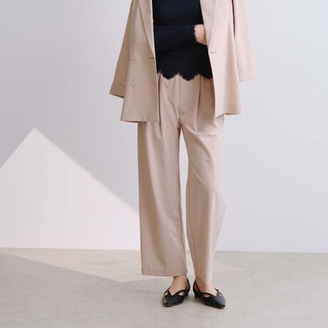 一見するとウエストALLゴムには見えないのに、穿き心地が抜群のおすすめパンツ。機能性も満載の素材なので、真夏までずっと着回せます。タック入りなので体型カバーもしつつ、ストレートラインで脚をまっすぐきれいに見せてくれます!