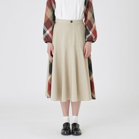 [型番:55S03721__]◆サイドのクレストブリッジチェックがポイントのフレアスカート【Design】腰回りをすっきりみせてくれる、こだわりのシルエットが魅力のスカートです。柔らかに裾に広がるフレアデザインが、動きに合わせて軽やかに広がります。後ろウエストはゴム仕様で履き心地もよく、フロントは腰回りをスッキリと見せて、トップスとのバランスがとりやすくデザインしました。