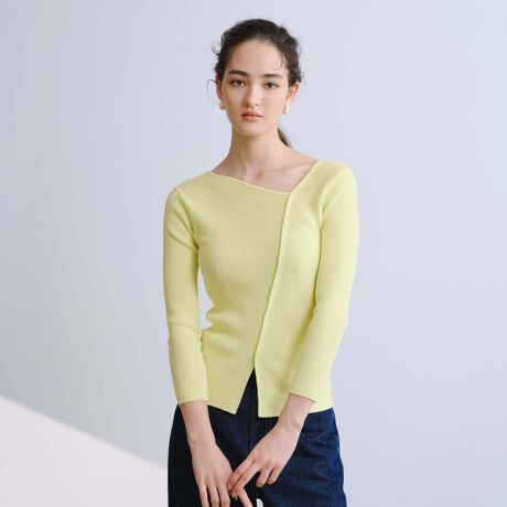 アシンメトリーなネックラインと斜めに入った編地切り替えで、着るだけでスタイルアップ効果抜群のニット。デコルテも綺麗に見えて、インナーとしても着映えするアイテム。ON/OFF着回せて、合わせるボトムによってオフィスにも休日のカジュアルにも色々なスタイリングが楽しめます。
