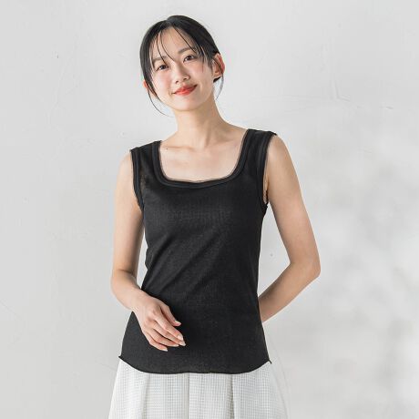 太めの肩幅設計で下着が見えにくく、一枚でも安心感のある着心地。
