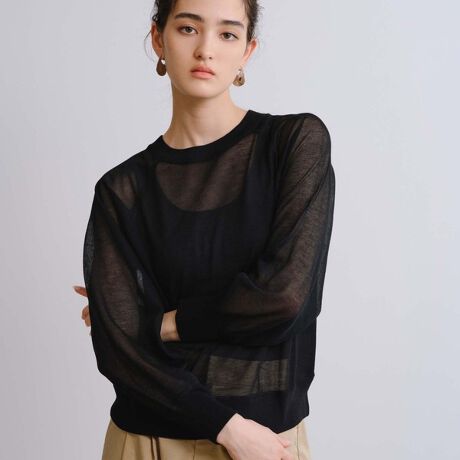 ラグランスリーブ、脇の接ぎ合わせなど、トレーナー風の仕立てにこだわった、シアーニット。カジュアルに見えがちなスウェットを大人っぽく上品にクラスアップして見せるデザインです。