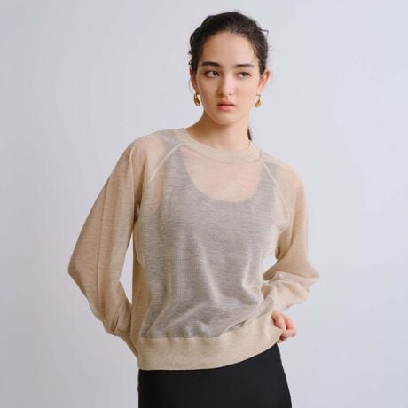ラグランスリーブ、脇の接ぎ合わせなど、トレーナー風の仕立てにこだわった、シアーニット。カジュアルに見えがちなスウェットを大人っぽく上品にクラスアップして見せるデザインです。