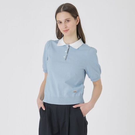 [型番:55N07724__]◆ブルーレーベルらしいディテールが詰まったニットポロ【Design】やわらかな着心地の良いニット素材を使用したデザインニットです。トレンドのポロ衿デザインにギャザーの入った袖で甘さをプラスしました。前立てから覗くクレストブリッジチェックがアクセントになります。裾部分にはゴールドのプレートがついています。
