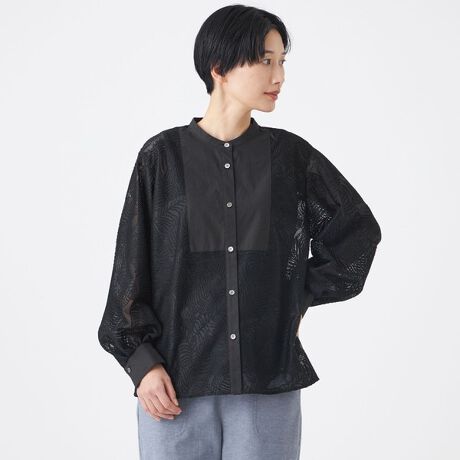 リーフとゼブラを全面に取り入れたレース柄が涼しげな印象を与えるバンドカラーシャツブラウス。前立てやカフス部分には無地の素材を使用し、柄とのコントラストでシャープな印象をプラスしています。袖はパフスリーブで、柔らかさと立体感をキープしながら、おしゃれな着こなしが楽しめる一枚です。