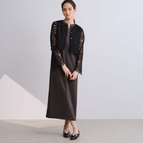 (ボレロ) 立体感のある柄が映える、上品で清涼感のあるレース素材。程よい透け感が軽やかさを演出します。 (ワンピース) 落ち着いた質感が魅力の上品な素材。程よい厚みとハリ感があり、立体的で美しいシルエットをキープ。シンプルながらもきれいめな表情です。
