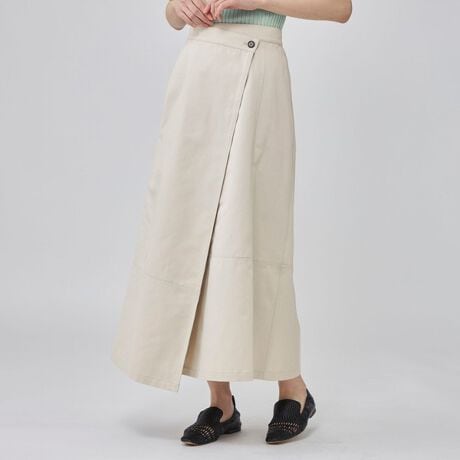 【構築的なシルエットが際立つ、ラップ風チノスカート】