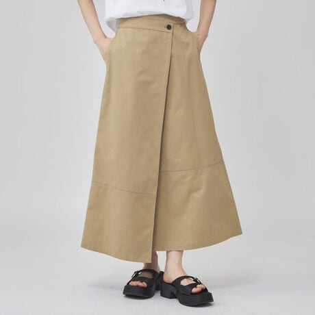 【構築的なシルエットが際立つ、ラップ風チノスカート】