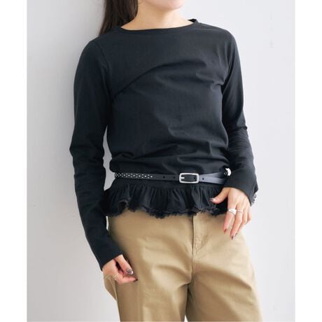 裾にフリルをあしらった、フェミニンな印象のミディカットトップス。