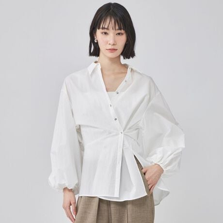 リラックスフィットで抜け感のある着こなしに。脇のボタンを留めてカシュクールにすれば、上品でメリハリのあるスタイルに変化します。袖口はゴム仕様で、ふんわりとしたシルエット調整も簡単に出来ます。