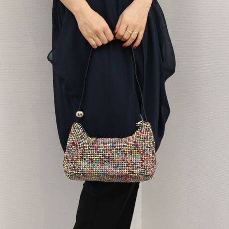 キラキラと輝くカットガラスを贅沢にあしらった、華やかさが際立つワンハンドルのパーティバッグ。