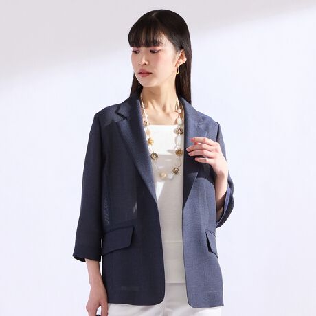 すっきりとシンプルなテーラードジャケット。前はボタン無し、ホックで留める仕立て。さっと織ってサマになるサマージャケットです。