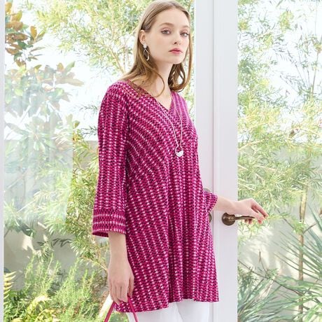 ドライタッチで清涼感ある素材を使用したチュニックTシャツ。ストライプにドットをミックスさせたプリント。ピンクはリリアンビューティのオリジナルカラーです。