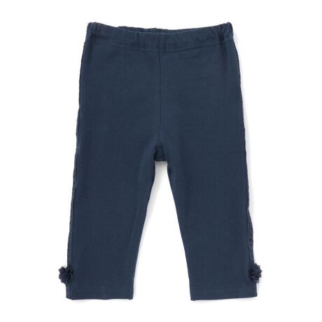 サイドのレーステープと、裾にあしらった花シフォンが可愛いアクセントになった女の子用6分丈レギンス。