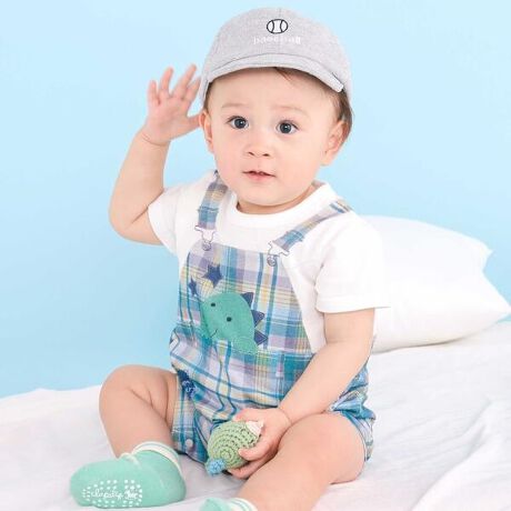 カラーごとにデザインが異なる、男の子ベビー用のサロペット風カバーオール。