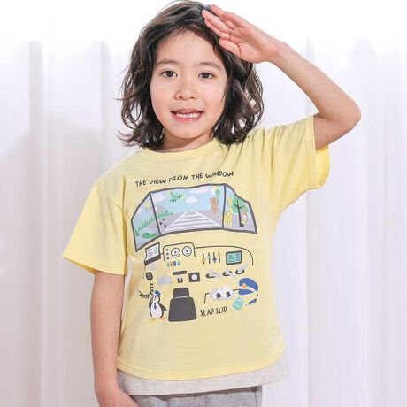 まるで乗り物の操縦席に座って外を眺めているような、ユニークで楽しいプリントが目をひく男の子用半袖Tシャツ。