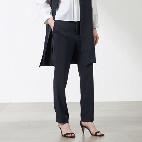 テーパードシルエットのパンツです。脇シームを前側にし、前幅を狭くすることによってすっきりと見えるデザインに仕立てています。