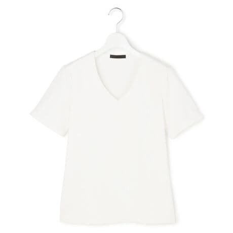 ■デザインVネック衿の開きや、ボディラインをきれいに見せるシルエットが特徴の半袖ジャージーカットソーです。シャープなカッティングとステッチの入らない襟元でデコルテ映えが叶います。前身頃が二重になっており透けにくく、一枚でも安心してお召し頂けます。
