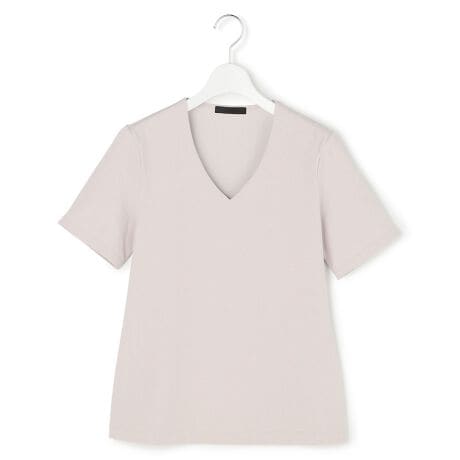 ■デザインVネック衿の開きや、ボディラインをきれいに見せるシルエットが特徴の半袖ジャージーカットソーです。シャープなカッティングとステッチの入らない襟元でデコルテ映えが叶います。前身頃が二重になっており透けにくく、一枚でも安心してお召し頂けます。