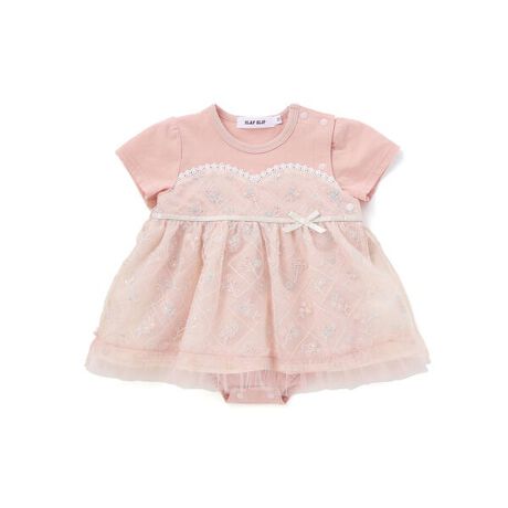 チュールの華やかさと裾のフリルがとびきり可愛い、女の子ベビー用のカバーオール。