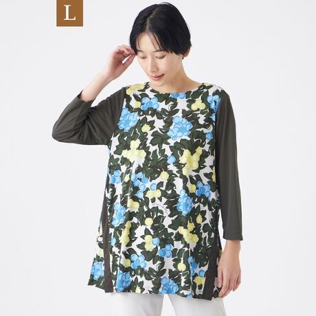 肩まわりはコンパクトに見せつつ、程よいゆとりを残したシルエットに仕上げたカットソー。ウエスト位置から裾に向かって無地生地を切り替えることで、自然なラインのアクセントをつくり、すっきりとした印象に。長すぎない着丈で腰まわりをきれいに見せ、気になるヒップ周りもカバーできます。