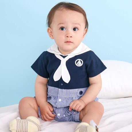 マリンムードたっぷりの異素材ドッキングが可愛い、男の子ベビー用カバーオール。