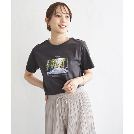 きれいめな印象で着られるコットン100%の素材を使用したロゴフォトプリントTシャツ。
