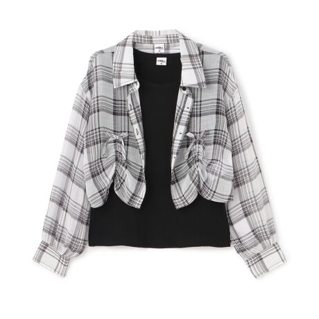 やや透け感のあるチェックシャツとタンクトップのセットです。サイドのドロストでシルエットに変化をプラス。丈に差をつけているため、シャツを開けても閉じてもおしゃれに決まります。合わせるインナーで個性を出すのもおすすめです。※milkycoastはPupil Houseのお姉さんブランドです