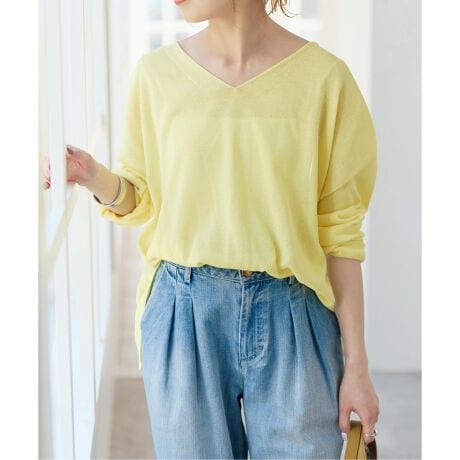 深すぎないVネックとほどよくゆとりのあるシルエットは、タンクトップやキャミソールとのレイヤードも楽しめ、抜け感のあるスタイリングに。デニムでカジュアルに、スラックスやスカートできれいめにと、幅広いコーディネートにマッチします。