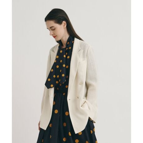 ウールの様な膨らみもありつつ透け感のあるカラミ素材なので季節の変わり目の羽織に丁度良く、ツウィーディーな見え方がクラス感を上げてくれる、マニッシュかつ抜け感のある大人JK。ボディーラインを拾わない程良いサイズ感なのでキチンと見えつつも抜け感があり、デニムボトムなどとも着まわせる万能ジャケットです。