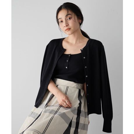 ヘンリーネックデザインのインナーとカーディガンがセットになったニットアンサンブル。