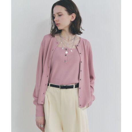 ヘンリーネックデザインのインナーとカーディガンがセットになったニットアンサンブル。
