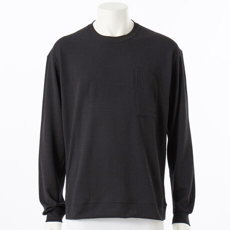 通気度が高く、風通しのよい生地を採用、夏の暑さに対応する肌触りのよい長袖ニットソー/特徴・ダブルニット構造と麻調の強撚糸の採用で、通気性と遮熱性を両立・生地の裏面はフィラメント糸を使用し、肌触り、肌離れがよい・左胸にハーフドーム型のポケット/生地・素材・表面はシャリ感がありカジュアルな印象・裏面は肌触りがよくなめらか・生地の透け感も抑えられるダブルフェイス構造/機能・デザイン・裾と袖口は共地でカジュアルな印象・UVガード(UPF30-50+、紫外線カット率90%以上)機能付き/おすすめシーン・ライフスタイル、アウトドア