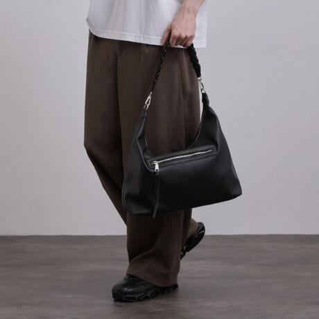 コーディネートのアクセントになる、デザイン性の高いショルダーストラップが特徴のバッグ。