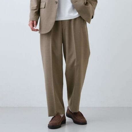 ワイドテーパードパンツは、腰や太もも周りにゆとりがありつつ、裾に向かって細くなるシルエットが特徴で、リラックス感とすっきりとした印象を両立できるアイテムです。