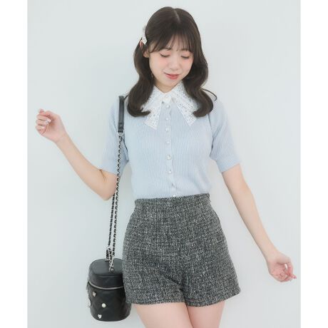 存在感のあるリボンディティールのレース襟が目を惹く、フェミニンムードたっぷりのニットに半袖バージョンが登場。