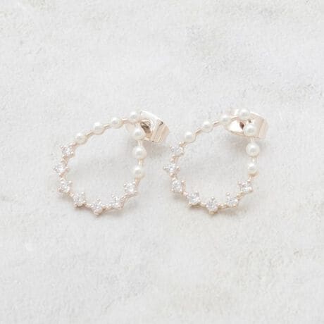 フェイクパールの柔らかな艶とビジューの繊細なきらめきが調和し、軽やかで日常使いしやすい質感です。