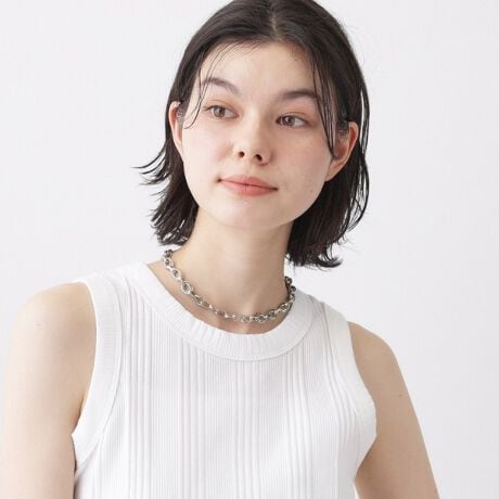 程よいボリューム感のチェーンが首元にアクセントを添え、シンプルなスタイリングも洗練された印象に。