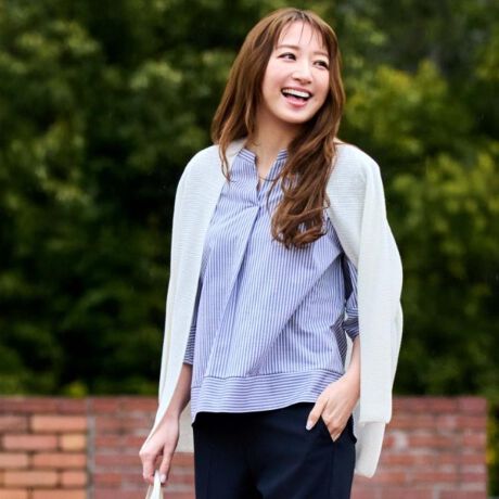 ヒップをカバーする着丈で、前裾を少し短くして軽めに見せています。