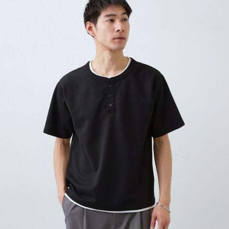 ヘンリーネック レイヤード 半袖Tシャツ 洗濯機OK