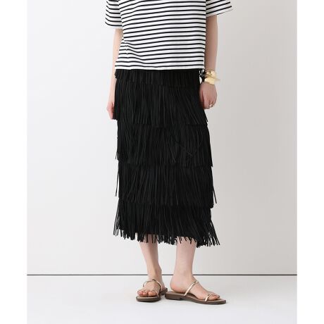 フリンジを何層にも重ねて仕立てた華やかなナロースカート。縦に流れるフリンジが歩くたびに揺れ、軽やかでドラマティックな印象を演出します。