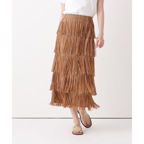 フリンジを何層にも重ねて仕立てた華やかなナロースカート。縦に流れるフリンジが歩くたびに揺れ、軽やかでドラマティックな印象を演出します。