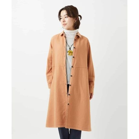 二重織りの素材感を活かした、ロング丈シルエットのブラウスです。小さめの襟付きデザインで、前を閉じればワンピース風に、開ければ羽織りとしても着用できる2WAY仕様です。前後のウエスト部分や後身頃の背中心に切り替えを入れることで、全体をすっきりと見せるデザインに仕上げています。