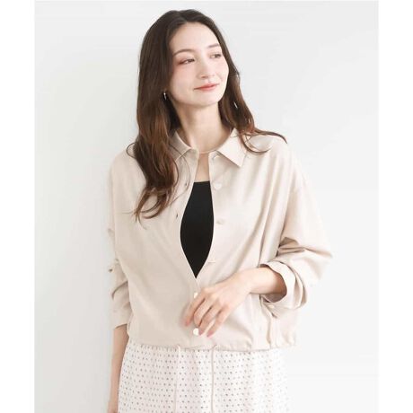 短めの丈感で、どんなボトムにも合わせやすく、羽織りとしても着こなせる便利なシャツブラウス。裾のドロストを絞ってふんわりさせた着こなしもおすすめです。