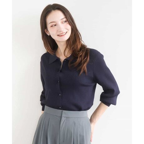 コンパクトな襟付きニット。前釦タイプですが、一枚着として前を閉じてプルオーバー感覚での着こなしがおすすめ。